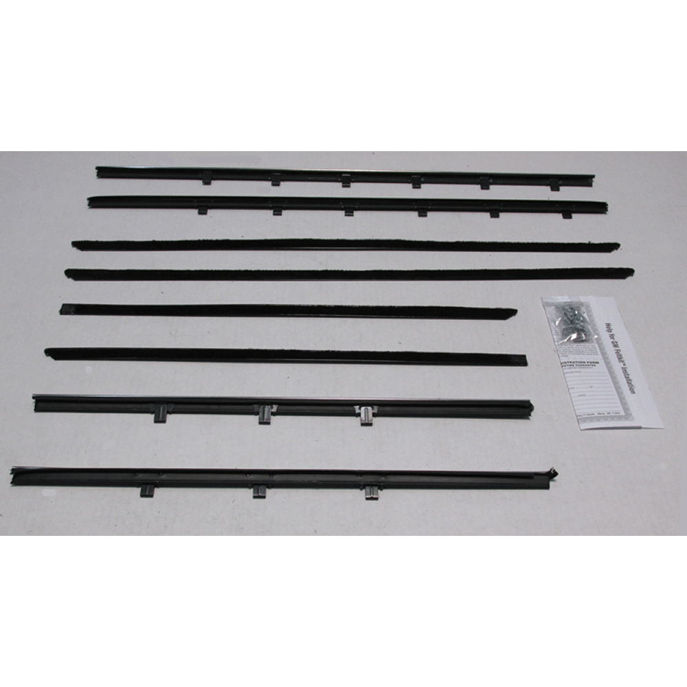 Beltline Weatherstrip - Complete 8 Piece Kit. Sometimes called sweepers, fuzzies or felts, these are the horizontal strips at the base of the glass that "brush" or "sweep" the glass as it goes up and down. Replacing seals & weatherstrips not only improves the look of your vehicle but it also makes for a quieter cab and protects from water damage. Poor fitting or worn out seals can leak air and water creating noise, vibration and rust. Protect your ride with our direct fit AMERICAN MADE weatherstrips for a factory look and perfect fit.