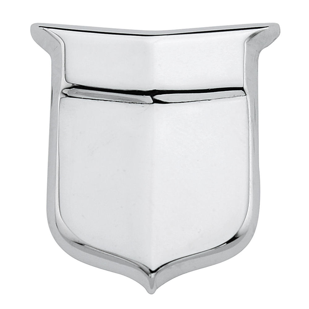 Front Fender Shield Emblem. Reproduced to original specifications, these fender tip crest emblems are cast and chrome-plated for a factory-correct appearance. The bottom portion of the emblem is polished, while the upper features a brushed finish for authenticity. Each emblem features a single 6-32 threaded stud and hex nut for fastening, as well as a single locating pin for precise installation.
