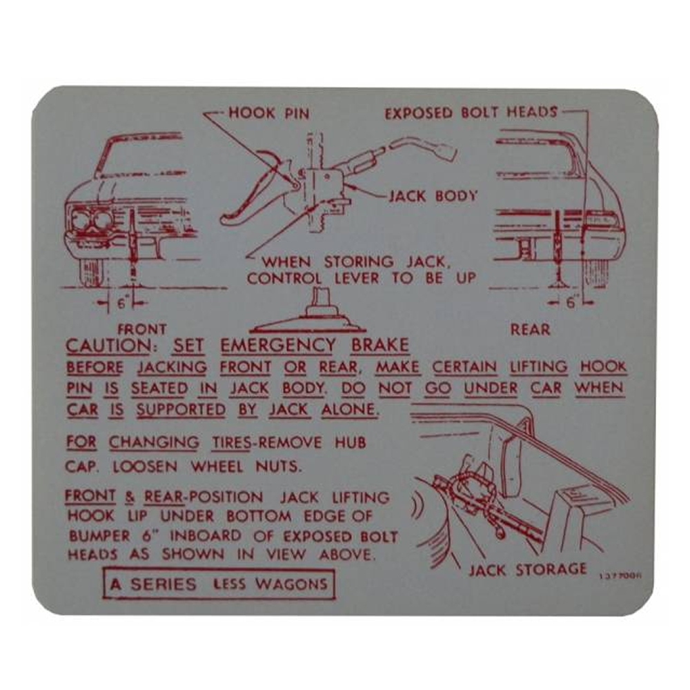Jack instructions decal. Replaces original GM part #1377006. Add that final touch to your restoration. Top quality, officially licensed GM reproduction. MADE IN THE USA.