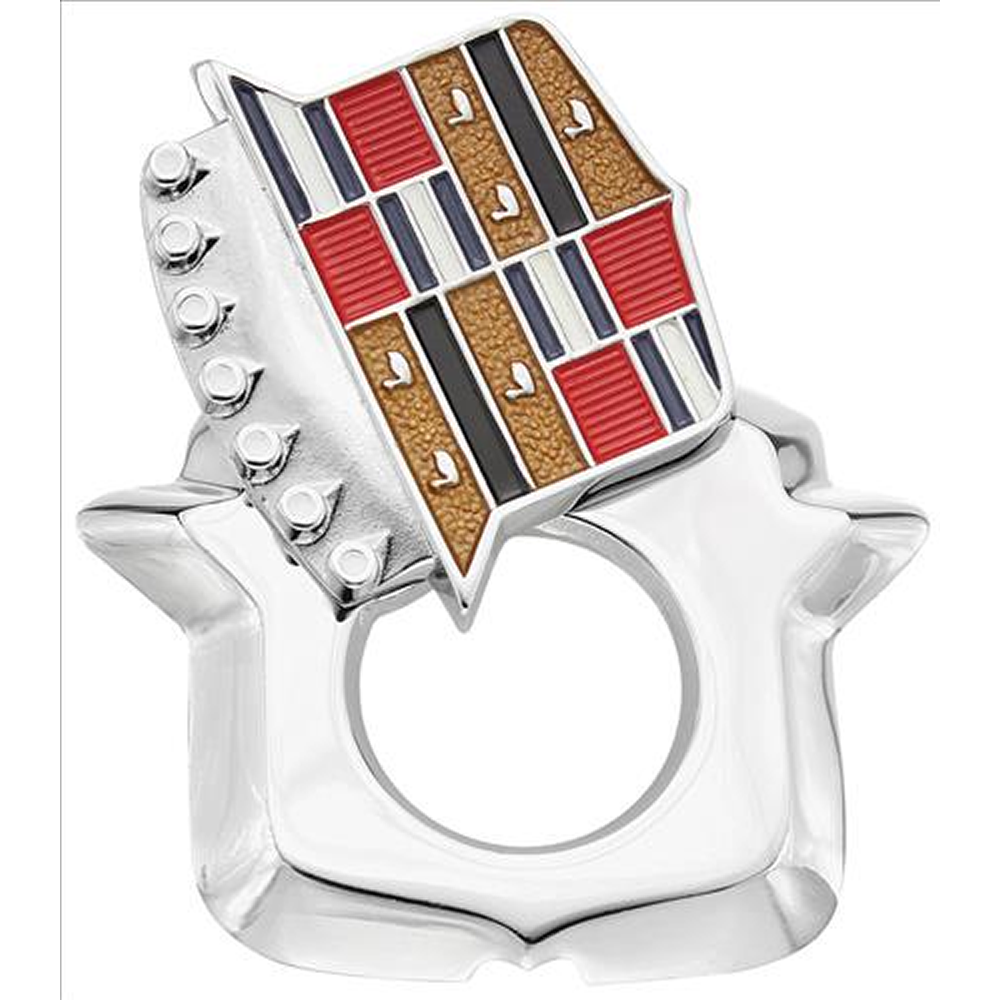 Trunk Lock Cover & Cadillac Crest. This sturdy reproduction trunk lock crest is precisely cast for an exact fit. Each emblem has a brilliant chrome-finish for great looks and includes the pivot post and a painted face for added detail.