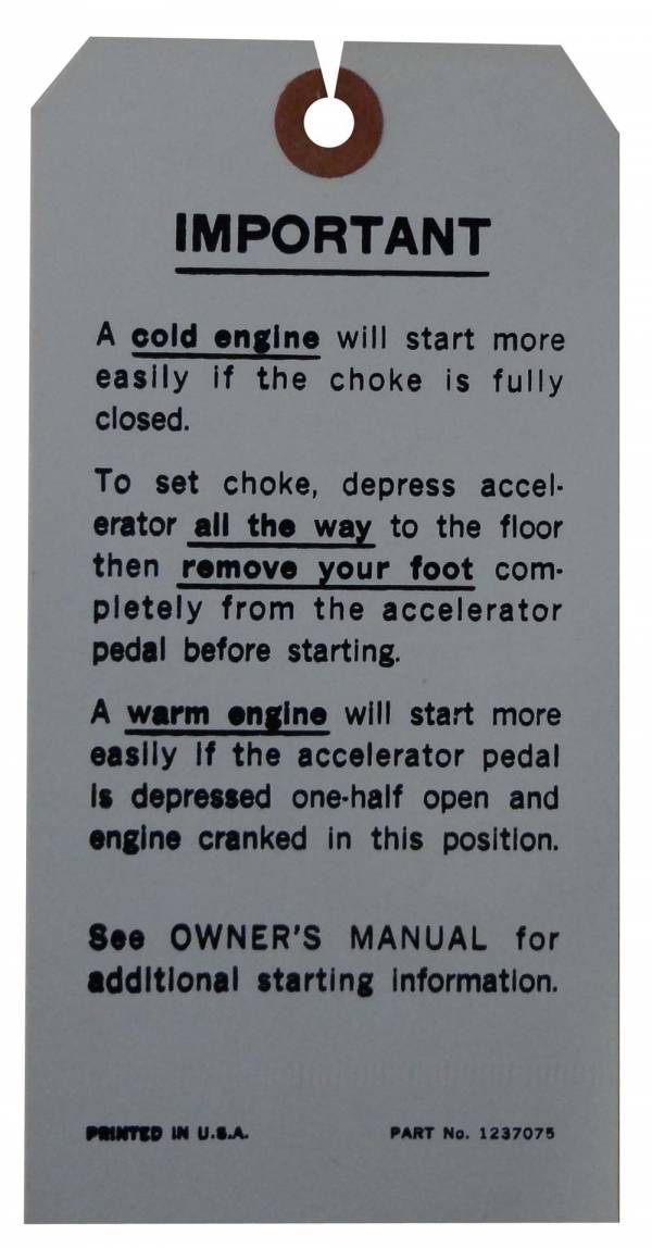 Engine starting instructions tag. Replaces original GM part #1237075. Add that final touch to your restoration. Top quality, officially licensed GM reproduction. MADE IN THE USA.