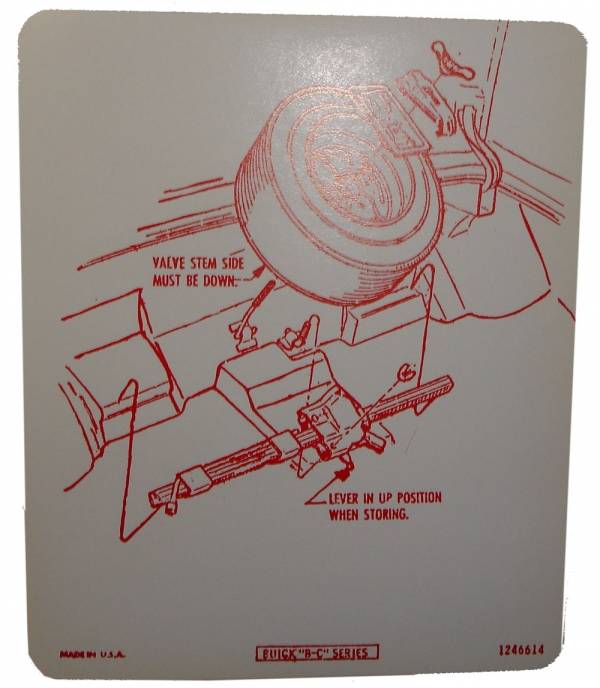 Tire stowage decal - for models with specialty wheels. Typically found on underside of trunk lid. Replaces original GM part #1246614. Add that final touch to your restoration. Top quality, officially licensed GM reproduction. MADE IN THE USA.
