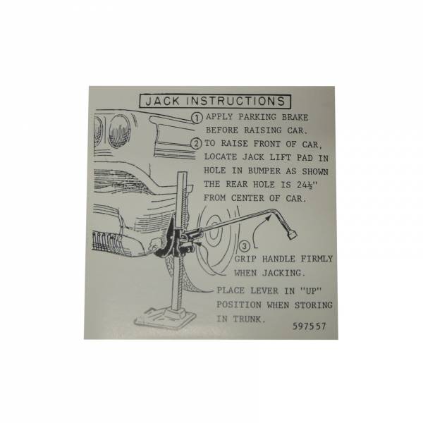 Jack instructions tag. Replaces original GM part #597557. Top quality, official GM reproduction, MADE IN THE USA.