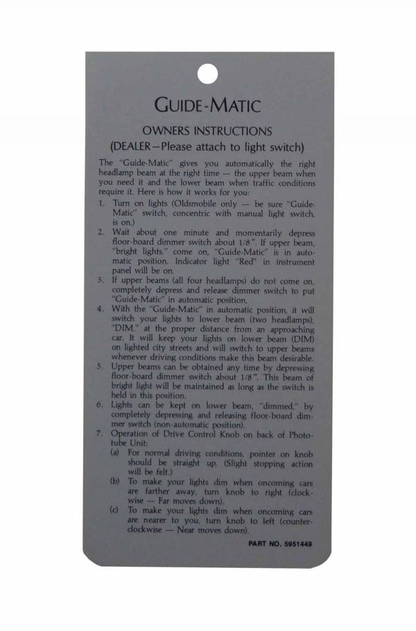 Headlight Guide-Matic instructions tag. Replaces original GM part #5951449. Add that final touch to your restoration. Top quality, official GM reproduction, MADE IN THE USA.