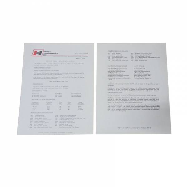 1974 Hurst / Oldsmobile facts sheet. Top quality reproduction of original sales brochure. Officially licensed GM product, MADE IN THE USA.