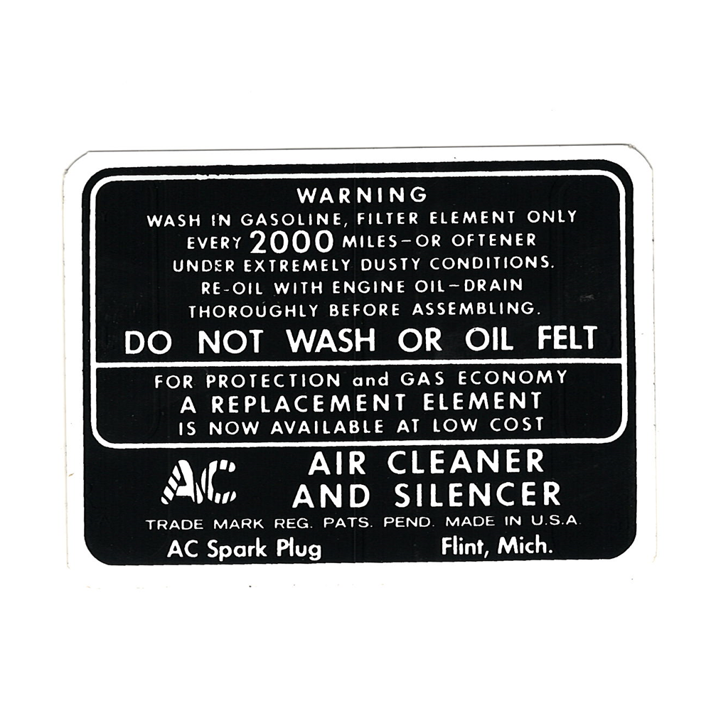 Air cleaner instructions decal. Nothing adds that final touch like the proper decals. Our American made reproductions will make your car stand out.