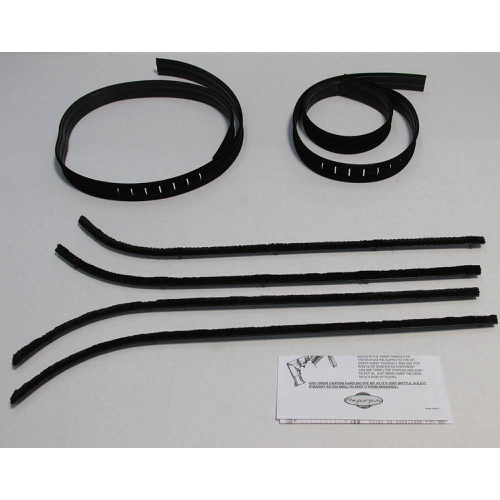 - Six (6) piece kit includes inner and outer beltline on both doors and the window run channels for the top & back of the glass