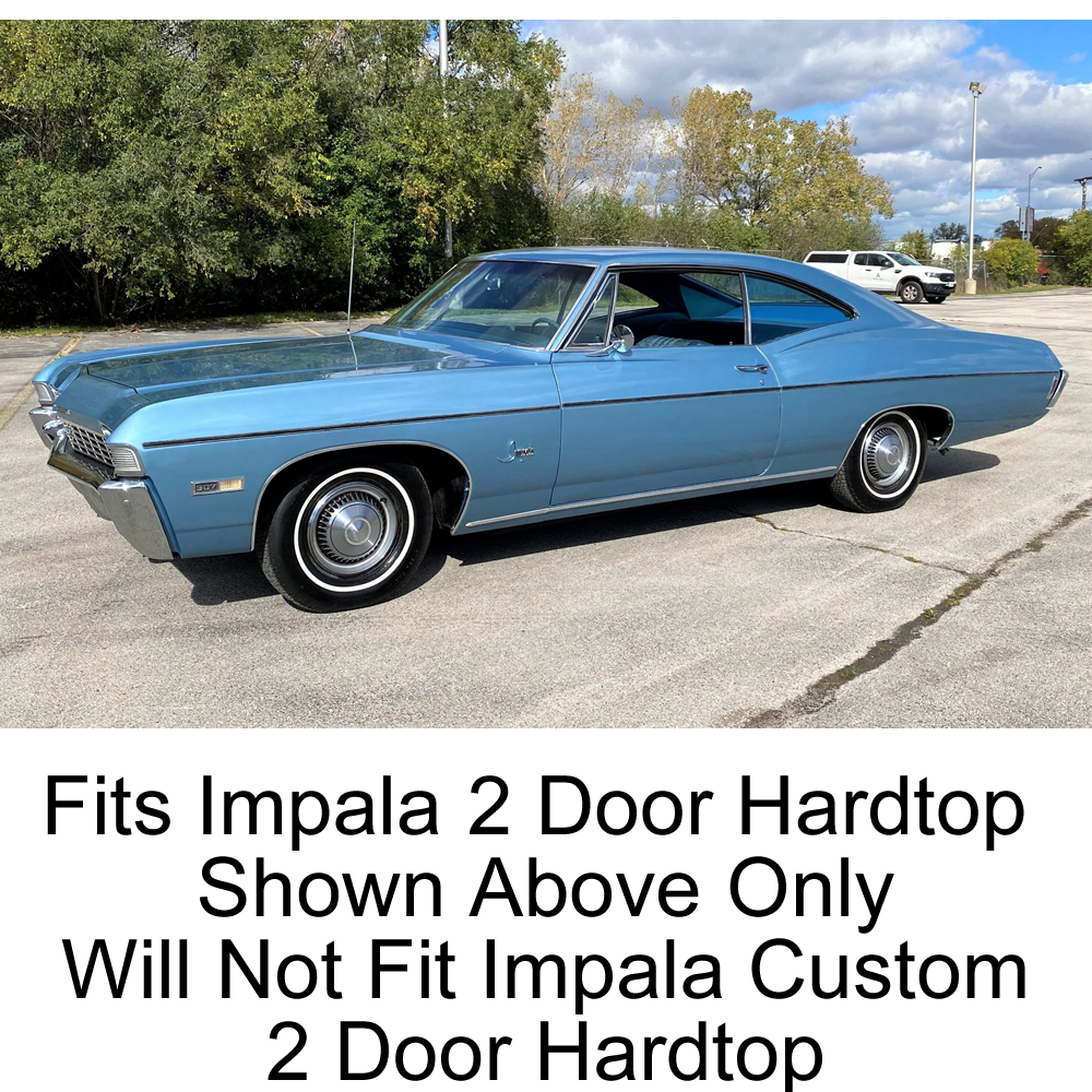 - Fits 1967-1968 Chevrolet Impala 2 Door Hardtop only which has the longer quarter window - does not fit the 68 Impala Custom with the shorter quarter window - see our #10-084E for the 68 Impala Custom