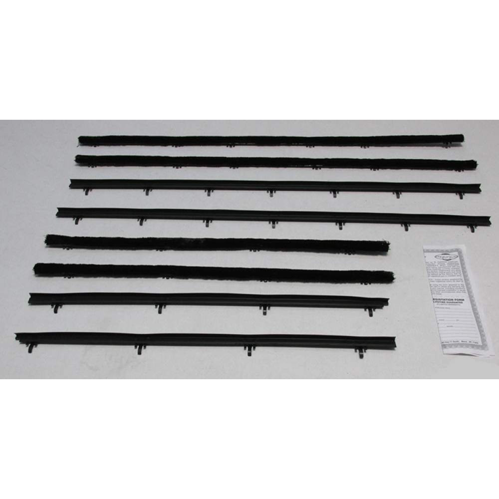 Beltline Weatherstrip - Complete 8 Piece Kit. Sometimes called sweepers, fuzzies or felts, these are the horizontal strips at the base of the glass that "brush" or "sweep" the glass as it goes up and down. Replacing seals & weatherstrips not only improves the look of your vehicle but it also makes for a quieter cab and protects from water damage. Poor fitting or worn out seals can leak air and water creating noise, vibration and rust. Protect your ride with our direct fit AMERICAN MADE weatherstrips for a factory look and perfect fit.