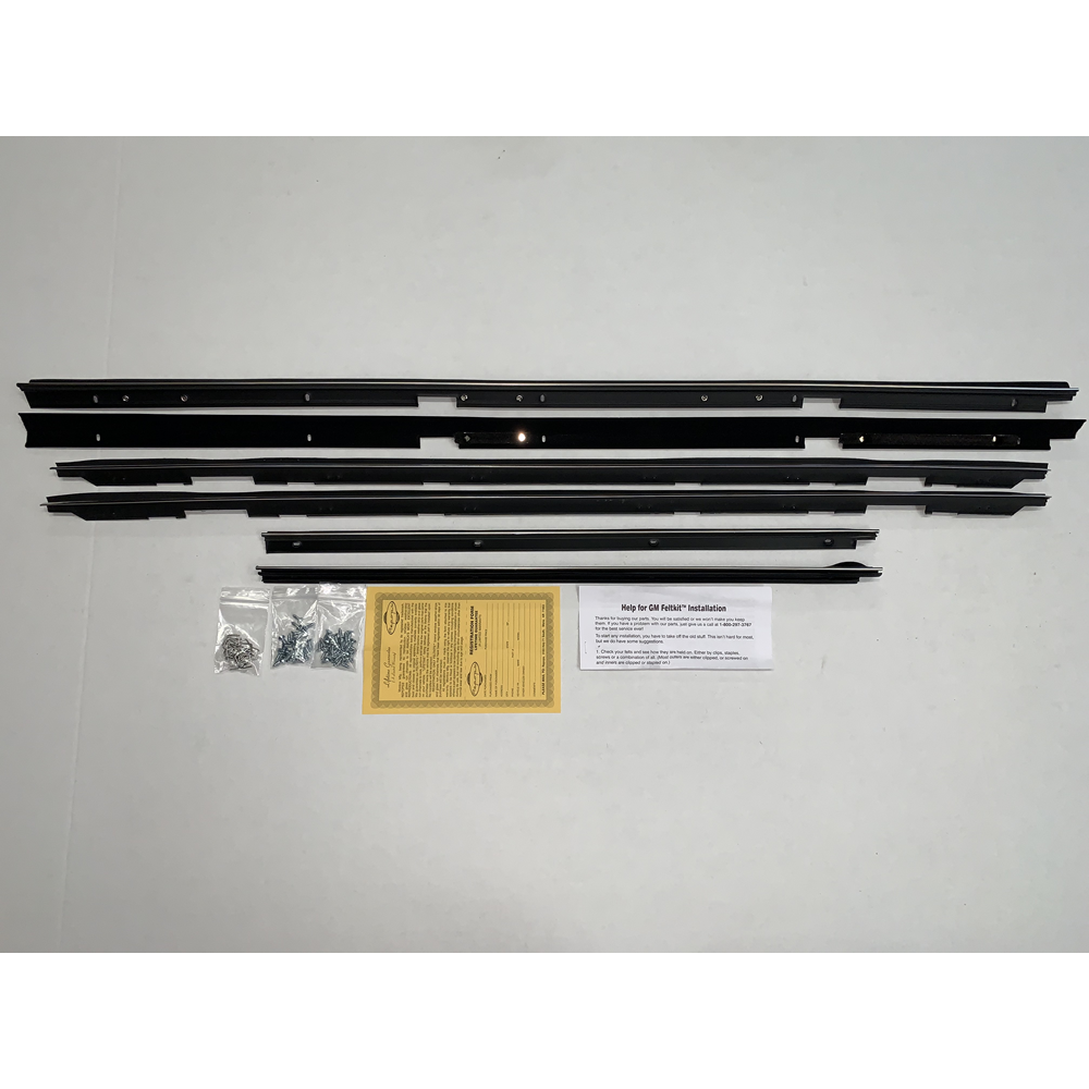 Beltline Weatherstrip - Complete 6 Piece Kit. Sometimes called sweepers, fuzzies or felts, these are the horizontal strips at the base of the glass that "brush" or "sweep" the glass as it goes up and down. Replacing seals & weatherstrips not only improves the look of your vehicle but it also makes for a quieter cab and protects from water damage. Poor fitting or worn out seals can leak air and water creating noise, vibration and rust. Protect your ride with our direct fit AMERICAN MADE weatherstrips for a factory look and perfect fit.