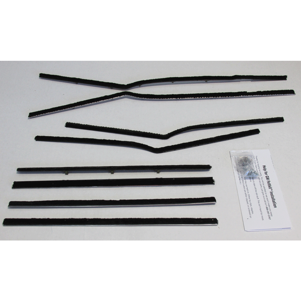 Beltline Weatherstrip - Complete 8 Piece Kit. Sometimes called sweepers, fuzzies or felts, these are the horizontal strips at the base of the glass that "brush" or "sweep" the glass as it goes up and down. Replacing seals & weatherstrips not only improves the look of your vehicle but it also makes for a quieter cab and protects from water damage. Poor fitting or worn out seals can leak air and water creating noise, vibration and rust. Protect your ride with our direct fit AMERICAN MADE weatherstrips for a factory look and perfect fit.