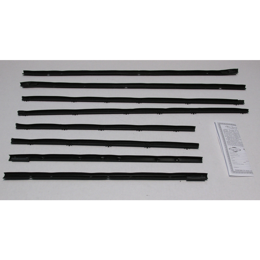 Beltline Weatherstrip - Complete 8 Piece Kit. Sometimes called sweepers, fuzzies or felts, these are the horizontal strips at the base of the glass that "brush" or "sweep" the glass as it goes up and down. Replacing seals & weatherstrips not only improves the look of your vehicle but it also makes for a quieter cab and protects from water damage. Poor fitting or worn out seals can leak air and water creating noise, vibration and rust. Protect your ride with our direct fit AMERICAN MADE weatherstrips for a factory look and perfect fit.