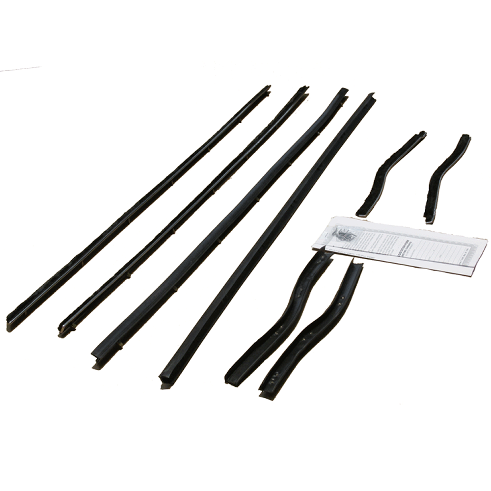 Beltline Weatherstrip - Complete 8 Piece Kit. Sometimes called sweepers, fuzzies, anti-rattlers or felts, these are the horizontal strips at the base of the glass that "brush" or "sweep" the glass as it goes up and down. Poor fitting or worn out seals can leak air and water creating noise, vibration and rust. Protect your ride with our direct fit, AMERICAN MADE weatherstrips for a factory look and perfect fit.