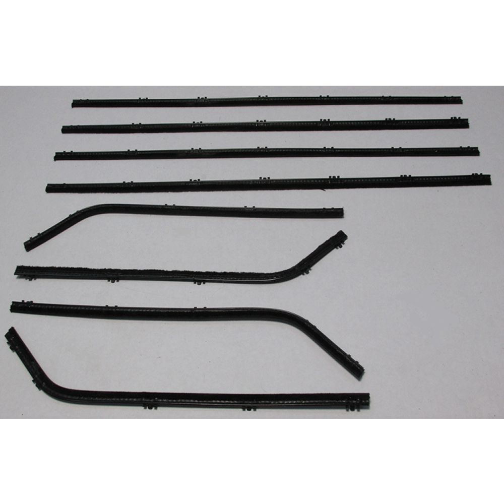 Beltline Weatherstrip - Complete 8 Piece Kit. Sometimes called sweepers, fuzzies, anti-rattlers or felts, these are the horizontal strips at the base of the glass that "brush" or "sweep" the glass as it goes up and down. Poor fitting or worn out seals can leak air and water creating noise, vibration and rust. Protect your ride with our direct fit, AMERICAN MADE weatherstrips for a factory look and perfect fit.